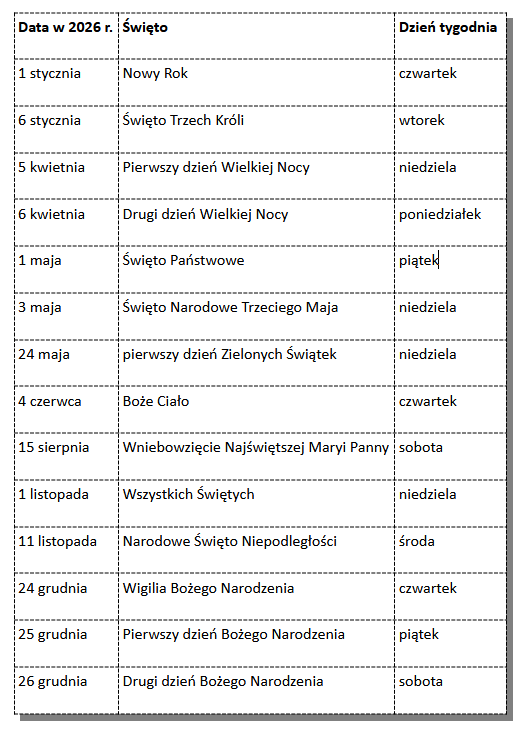 Dni wolne od pracy to wszystkie niedziele oraz święta państwowe i kościelne, których jest 14. Poniżej lista dni świątecznych wolnych od pracy w 2026 roku: