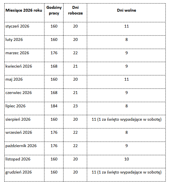 Ile jest godzin pracy, dni roboczych i dni wolnych od pracy w poszczególnych miesiącach 2026 roku?