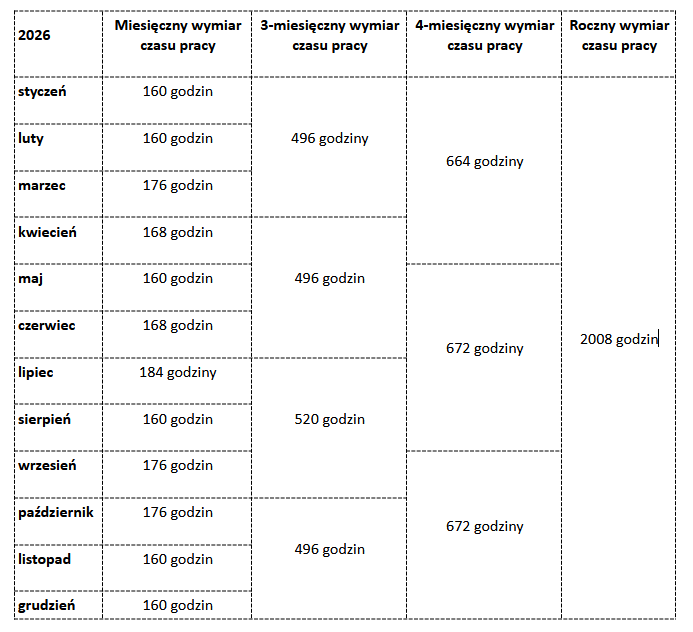 Ile wynosi miesięczna, 3-miesięczna i 4-miesięczna norma czasu pracy 2026?